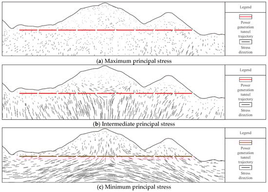 The features of the geostress field on the regional vertical profile are shown in Figure 10 and Figure 11. The maximum principal stress , intermediate principal stress , and minimum principal stress are in ranges of 12.42 to 38.83 (26.11 on average), 5.74 to 34.94 (17.9 on average), and 2.17 to 25.02 (13.55 on average), respectively. The distribution of regional vertical principal stress is significantly affected by the topographic effect, which is shown as a high geostress value in regions of thick overlying strata. On the whole, the vertical geostress field presents characteristics of significant non-linearity in its distribution with stresses fluctuating significantly with changes in the depth and terrain.