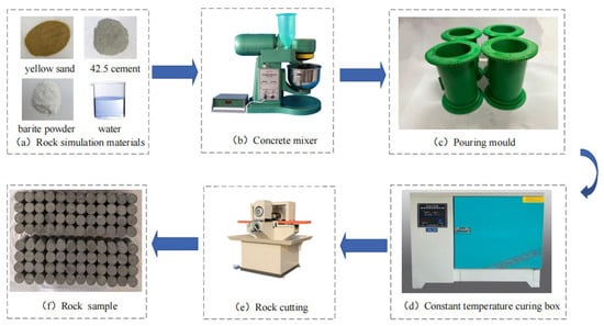 According to the requirements of the “Standard Test Methods for Engineering Rock Mass” (GB/T50266-2013) [], prepare standard cylindrical specimens with a diameter of 50 mm and a height of 100 mm. Ensure that the non-parallelism of the two ends of the specimens does not exceed 0.05 mm, and the end faces are perpendicular to the axis of sandy slate, with a maximum deviation of no more than 0.25°. The preparation process is shown in Figure 1, and each sub-figure corresponds to the following key steps: (a) Is the simulated material of cement, sand, water, and barite powder (mass ratio 1:1:0.5:0.6); (b) Use a mixer to evenly mix the materials in the prescribed proportion; (c) Pour the mixture into a mold (a cylinder with a diameter of 50 mm and a height of 100 mm) to allow it to solidify and take shape; (d) After demolding, place the initial blank sample in the curing box for curing; (e) Use a cutting machine to grind the end face and the periphery of the sample (control the non-parallelism of the two end faces ≤ 0.05 mm, and the deviation of the perpendicularity of the end face to the axis ≤ 0.25°); (f) Obtain complete samples that comply with the “Standard Test Methods for Engineering Rock Mass” (GB/T50266-2013) to prepare for the subsequent prefabricated joint and mechanical tests.