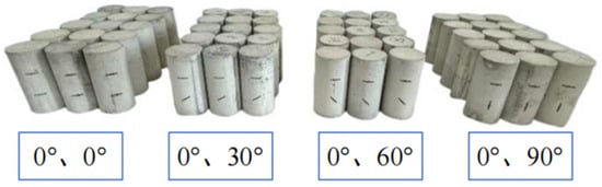 The complete model sample was cut by water jet cutting. The joint width was processed with a 1 mm water jet nozzle (cutting speed of 5 mm/s, random inspection deviation ≤0.05 mm), and the length was processed according to the 15 mm radial path preset by CAD (laser detection deviation ≤ 0.1 mm, radial offset ≤ 0.2 mm). The preset inclination angle is positioned with a 0.1° precision fixture and detected with a 0.05° precision digital display angle meter (3 sections, deviation ≤ 0.2°, error traceable). The inclination angle of one joint is fixed at 0°. Another joint has inclination angles of 0°, 30°, 60°, and 90°, respectively (referred to as the through-double-joint sandy slate with inclination angles of 0°, 30°, 60°, and 90°), with a joint length of 15 mm and a width of 1 mm. Meanwhile, the surface roughness and matching degree of the joints are controlled by alcohol residue removal, synchronous processing in the same batch, and positioning pin splicing (error ≤ 0.02 mm) to ensure the geometric and state accuracy of the joints. The cut sandstone slate joint-like rock material sample is shown in Figure 2.