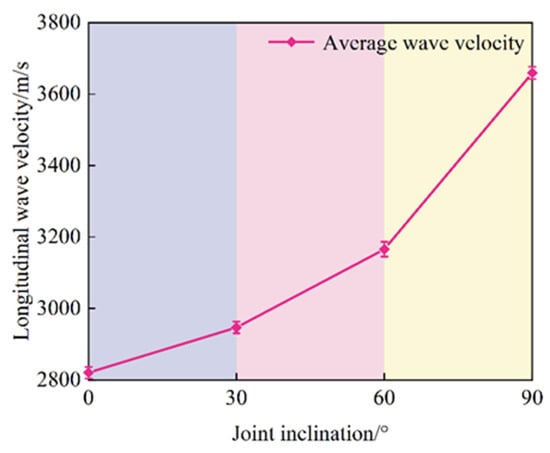 To ensure the accuracy of the test results and the homogeneity of the rock samples, the longitudinal wave velocity of the sandy slate was measured using a non-metallic ultrasonic instrument. The results of determining the through-type double-joint sandy slate are presented in Figure 3. The “upper and lower boundaries” corresponding to each group of inclination angles in the figure represent the measured discrete range (maximum–minimum value) of the longitudinal wave velocity of the three parallel specimens, specifically: 0° (2780–2860 m/s), 30° (2905–2989 m/s), 60° (3112–3220 m/s), 90° (3600–3704 m/s). The boundary determination is based on the “Standard Test Methods for Engineering Rock Mass” (GB/T50266-2013), and is obtained through acoustic wave tests of three parallel samples (the same material, the same process, and the same curing), reflecting the objective dispersion (dispersion rate ≤ 3%) caused by the micro-homogeneity of the material and the slight deviation of the preparation process. It does not affect the core law that “the wave speed increases with the joint inclination angle”. The average longitudinal wave velocities at joint inclinations of 0°, 30°, 60°, and 90° were 2820, 2947, 3166, and 3652 m/s, respectively. The differences in wave velocities were primarily attributed to the variation in the angle between the joint surface and the direction of wave velocity propagation. When the joint inclinations were smaller, the joint surface was approximately parallel to the direction of wave propagation, which caused a stronger hindrance effect on the wave and a greater energy loss. As the inclination angle increased, the angle between the joint surface and the direction of wave propagation gradually changed, weakening its hindrance to wave propagation. In addition, the force-bearing structure formed within the rock mass due to the adjustment of the joint inclination angle is more conducive to wave transmission, and the wave velocity shows a gradual increasing trend. When the inclination reaches 90°, the plane becomes perpendicular to the direction of wave propagation. At this point, the cutting effect of the joints on wave propagation becomes minimal, the integrity of the rock mass improves, and energy loss is significantly reduced.