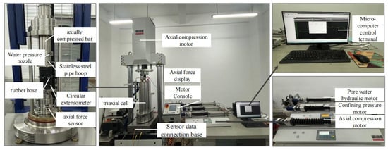 Conventional triaxial compression test: (1) Axial and confining pressures were applied simultaneously at a loading rate of 0.05 MPa/s under hydrostatic pressure conditions, reaching values of 2, 4, 6, and 8 MPa; (2) During the axial loading phase, the confining pressure was kept constant, and axial compression was applied at a rate of 0.002 mm/s until the specimen was completely fractured.