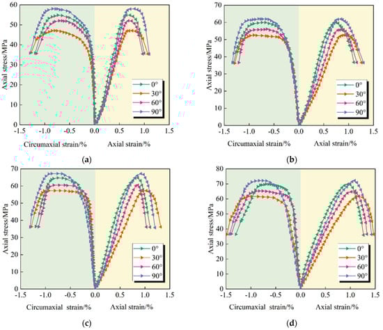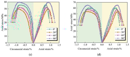 Stress/strain curves of through-double-joint sandy slate at different inclinations under increased axial pressure to relieve confining pressure. (a) The confining pressure is 2 MPa; (b) The confining pressure is 4 MPa; (c) The confining pressure is 6 MPa; (d) The confining pressure is 8 MPa.