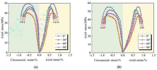 (1) The stress/strain curves of the four jointed rock masses with different inclination angles under two stress paths all present typical characteristics. With the increase in the inclination angle, the peak intensity shows a “V”-shaped variation trend of first decreasing and then increasing. Meanwhile, the stress path also has a certain influence on the peak strength, which is specifically manifested as a decrease in the peak strength of the joint specimen under unloading.