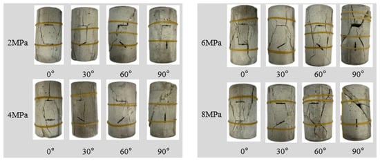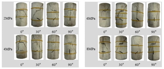 By comparing and analyzing the failure modes of specimens with different joint inclinations, it was found that the inclinations significantly controlled the failure path. At 0° inclination, the main crack extended perpendicularly to the joint plane through two parallel joints, accompanied by numerous secondary cracks, primarily because the parallel joints weakened the integrity of the rock mass, causing stress to be more likely concentrated and released in the direction perpendicular to the joints. At 30° inclination, the cracks preferentially spread along the first joint and forked to form an “eight” shape system, while only a few secondary cracks formed at the second joint. This asymmetry reflects the complex redistribution of stress at the joint ends for intermediate inclinations. When the inclination increases to 60°, the failure pattern shows obvious dependence on confining pressure. Cracks mainly propagate along the first joint at low confining pressure, and new cracks form at the second joint, with secondary cracks forming near the first joint at high confining pressure, indicating that confining pressure is a key factor controlling crack propagation at high inclinations.