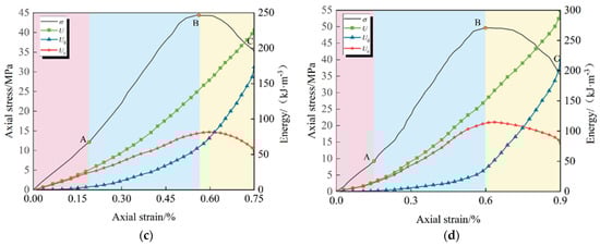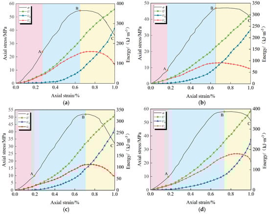 Energy evolution curve of conventional triaxial compression for double-joint specimens. (a) The inclination angle is 0°; (b) The inclination angle is 30°; (c) The inclination angle is 60°; (d) The inclination angle is 90°.