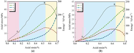 Shows the energy variation laws under the two loading methods. (a) Conventional triaxial compression; (b) Increased axial pressure to relieve confining pressure.