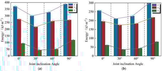Figure 11a presents the variation in sample energy during a conventional triaxial compression test, conducted under a confining pressure of 2 MPa and varying inclinations.