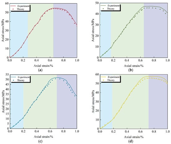 Axial stress/strain test curves of joints with different inclination angles under conventional triaxial compression versus theoretical model curves. (a) The inclination angle is 0°; (b) The inclination angle is 30°; (c) The inclination angle is 60°; (d) The inclination angle is 90°.