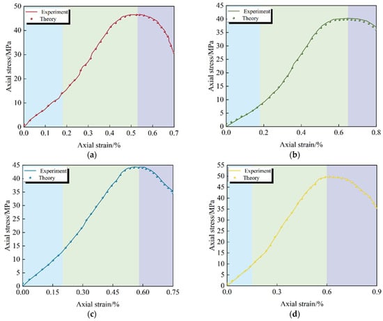 The comparison and verification of Figure 12 and Figure 13 show the theoretical curves of the damage constitutive model []. The two types of curves showed significant goodness of fit in the elastic phase and relatively good coincidence in the post-peak phase. It fully demonstrates that the model can reliably characterize the damage mechanics behavior of jointed rock under triaxial compression.
