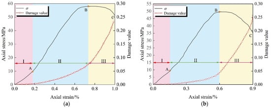 The damage evolution equations for specimens with different inclination angles, constructed based on the damage constitutive model, provide a foundation for systematically analyzing the damage evolution mechanism [] of jointed rock masses. Taking the responses of specimens with a 90° inclination angle under both conventional and unloading paths as an example (Figure 14), and combined with the three-stage characteristics of the axial stress/strain curve—the linear elastic stage (OA), the plastic yield stage (AB), and the post-peak failure stage (BC)—the damage evolution process is divided into three stages: the initial damage stage (I), the damage development stage (II), and the damage accelerated growth stage (III) for analysis.