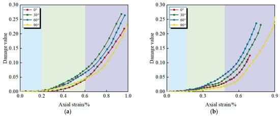 Figure 15 illustrates the damage evolution curves of jointed specimens with varying inclinations under triaxial compression along two stress paths. The figures reveal that the damage evolution trends of the specimens with varying joint inclinations in Figure 15a,b under triaxial compression exhibit similar patterns, and the damage evolution curves of the jointed rock mass increase nonlinearly with strain. Overall, the damage values of the jointed rock mass under triaxial compression exhibit a power function relationship with axial strain.
