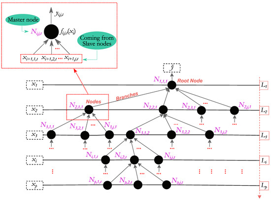 The master/slave concatenation is repeated throughout all the layers of the model, but the type of function, fi,j,t, used can be different in each case. The concatenation between nodes can be graphically interpreted by branches, while the global structure takes a tree shape with an initial root node that determines the prediction of y, which is ŷ. Figure 1 shows the global structure of a p design variable URBaM model.
