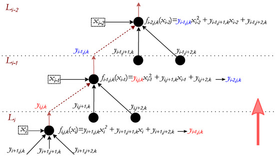 Once all the fi,j,t(xi) functions are defined, the Cj,t constant terms and the global structure of the URBaM model shown in Figure 1 are obtained. As a result, the URBaM model is completely defined. In order to predict y values of new x test points, ŷ(x), the x1, x2, …, xp design variable values are introduced progressively in the model from the last layer to the initial one. Thus, the xp design variable values of the test points and the determined Cj,t coefficient values are entered into the determined fp,j,t(xp) functions, obtaining the yi,j,t values of the nodes in the layer. Following the master/slave concatenation, each slave node will pass the determined yi,j,t values to its master node, and will be used in fp−1,j,t(xp−1) functions. This concatenation is repeated until the root node in the first layer is reached, where the output will be ŷ(x). Figure 4 shows an overview of the concatenation process followed by URBaM for determining ŷ(x).