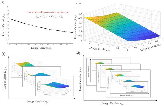 The URBaM model concatenates multiple 2D univariate regressions, and as a consequence, a global multivariate regression model is obtained. The univariate regressions are implemented progressively for each design variable layer to layer, starting from the last layer and finishing in the root node layer. Thus, in each layer the dimensionality of the nodes changes depending on the layer position. In the last layer nodes, when the xp design variable value is implemented in the regression functions fp,j,t(xp), the model acquires a 2D predictive model form (Figure 5a). When a new design variable, xp−1, is implemented in the univariate regression functions, fp−1,j,t(xp−1), of the Lp−1 layers, the model takes a 3D model shape (Figure 5b). Repeating the same process in the next layer, a 4D regression domain is obtained (Figure 5c). Further repetition results in a 5D regression domain (Figure 5d). Finally, the prediction of the test point, ŷ(x), is obtained in a (p + 1) dimension domain. The dimensionality in each layer can be determined by the following expression: p − (i − 2).