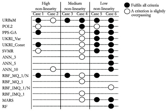 Some authors have defined general rules that associate specific types of surrogate models with the characteristics of particular case studies to facilitate the surrogate model selection [39,46]. Table 2 summarizes general guidelines from various authors, with a focus on the relationship between case study non-linearity and prediction accuracy.