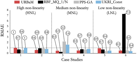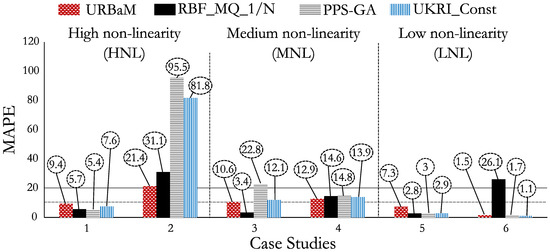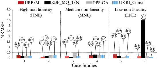 Figure 7 shows the MAPE, NRMSE, and RMAE values of the validation points predicted with the URBaM modelling technique for the six case studies. The obtained results show the following: