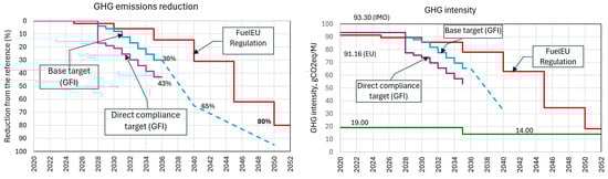 GHG emissions reduction according to FuelEU and IMO GFI (left) and the corresponding levels [] (right).