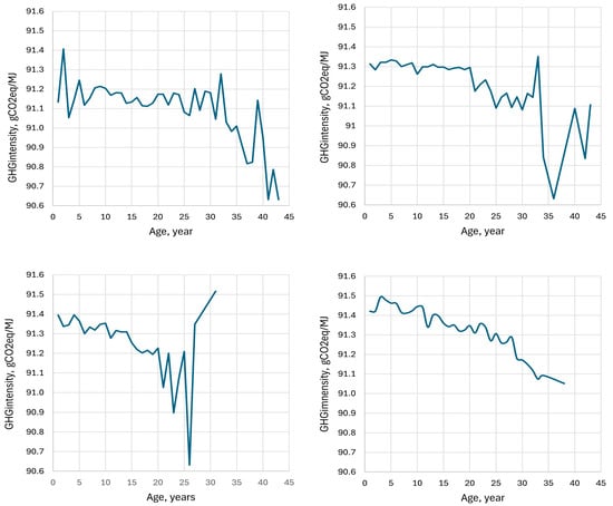GHG intensity as a function of age (upper left—general cargo ship, upper right—bulk carrier, lower left—tanker, lower right—container ship).