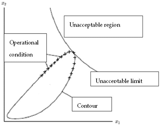 The contour approach [] identifies a “Contour” within the region covered by the operational parameters x1 and x2, where GHG emissions meet all criteria, ensuring that the probability of crossing does not exceed an “Unacceptable limit”. The crossing point of the “Contour” and the “Unacceptable limit” defines the mean extreme value of the operational parameters as can be seen in Figure 4.