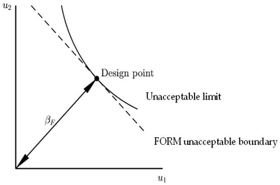The FORM is used to estimate the probability of crossing the GHG unacceptable limit (see Figure 5). The joint distribution is transformed into independent standard normal variables through the Rosenblatt transformation []. The design point is identified as the point with the highest probability on the failure surface in U-space. This point corresponds to the location on the GHG unacceptable surface that is closest to the origin.