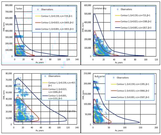 The contour represents extreme operational conditions, depicted as a curve that indicates equal probability for specific levels. These levels are determined by a joint function of the ship’s deadweight and age.