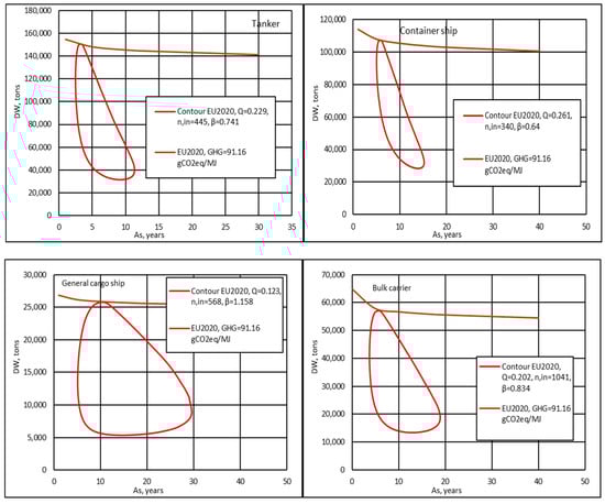 It can be identified that the most energy-efficient ships concerning the are the general cargo vessels, with a probability of exceeding greenhouse gas emissions within the contour of Q = 0.123. The expected number of ships visiting European ports that meet the allowable emissions limit is = 568, which is 48% of the total number of general cargo ships that visited European ports in 2023, and the reliability index, which represents the distance from the origin to the limit, is = 1.2. The extreme mean values are = 10.21 years and = 25,430. The least energy-efficient type of ship is the bulk carrier.