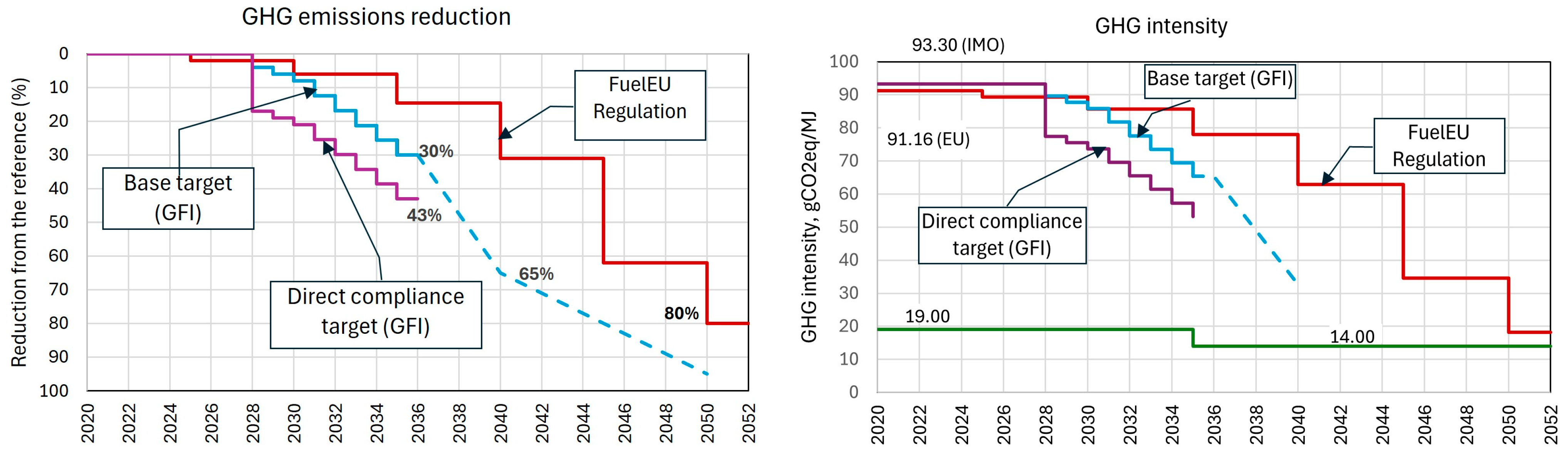 Enforcement structures | Direct, legally binding requirements under EU law, which are enforced by member states and monitored by accredited third-party verifiers. | The framework depends on flag-state enforcement through the MARPOL Annex VI regulations. The compliance will be confirmed by the IMO-maintained Global Fuel Intensity (GFI) registry. |