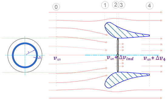 where and represent the velocity increments relative to the free-stream velocity at the rotor plane and at the shroud exit plane, respectively. Here, denotes the area of the rotor disc plane, while corresponds to the shroud exit plane area.