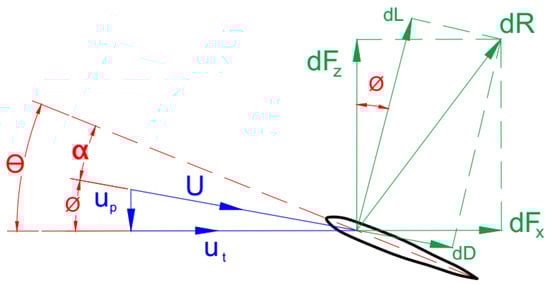 where is the local twist angle. Based on the value of the calculated local values of the angle of attack, Reynolds number, and cross-sectional airfoil type, the corresponding local lift coefficient, drag coefficient, and lift curve slope are obtained. So, the elementary lift, , and drag, , per unit span on the corresponding blade element can be then described by resolving the lift and drag forces into parallel and normal components relative to the rotor disk.