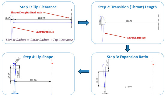 The shroud design process, based on four primary steps, is illustrated in Figure 3. The design emphasizes several critical geometric and aerodynamic factors, including rotor tip clearance, transition length, the diffuser expansion ratio, and inlet lip shape.