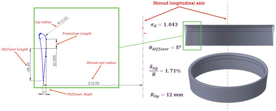 - Defining Lip Shape: A properly sized lip helps to guide incoming flow smoothly into the duct, minimizing separation and reducing inlet losses. Based on the available literature, the recommended lip radius typically falls within the range of 3% to 15% of the rotor diameter [49,50], providing notable aerodynamic benefits from shrouding, particularly under static conditions.