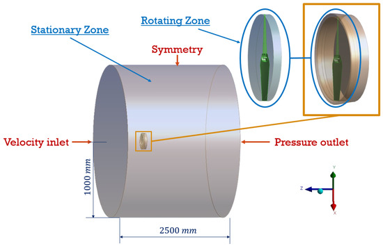 The CFD model incorporates appropriate boundary conditions and turbulence modeling strategies to accurately capture the flow physics of the shrouded rotor. ANSYS (2024 R1) FLUENT CFD software was used to perform the simulations, employing the Multiple Reference Frame (MRF) method to model rotor rotation in a steady-state environment. The computational domain is divided into two sub-domains: (i) a stationary domain, defined as a cylindrical volume with a length of 2500 mm and a diameter of 2000 mm, encompassing the entire simulated experimental setup and (ii) a rotating domain surrounding the rotor, as shown in Figure 5. A velocity inlet is specified at the inlet boundary, while a pressure outlet is applied at the outlet, and all surfaces are treated as no-slip walls.