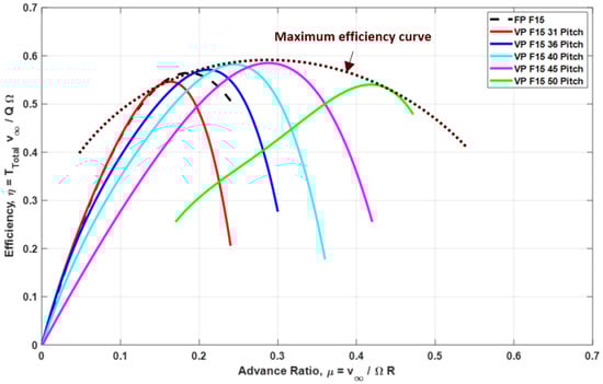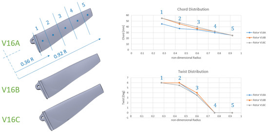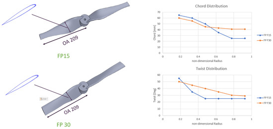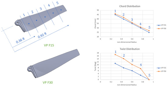 The VPR blade is divided into five radial segments, extending from the root cut-off radius of 45 mm to the tip. In contrast, the fixed-pitch rotor (FPR) blade is discretized into six radial elements, beginning at a smaller root cut-off radius of 22 mm. The difference in the number of elements is therefore a direct result of the different cut-off radii chosen for each configuration, which determine the spanwise region available for optimization.