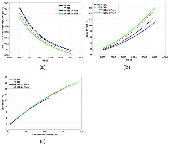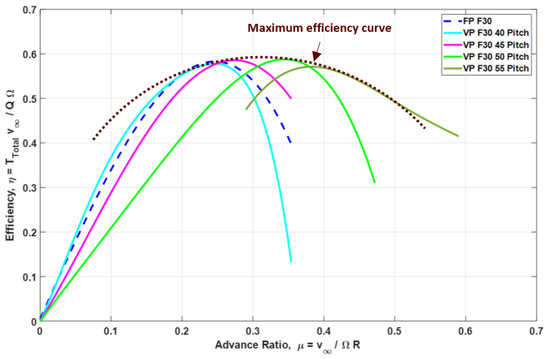 By adjusting blade pitch instead of relying solely on increased RPM, VPRs can reduce profile power consumption more effectively while maintaining performance, provided stall limits are not exceeded [31]. They also minimize control lag, as thrust modulation through pitch changes is significantly faster compared to the time required for motor speed adjustments. Furthermore, cyclic pitch enables compensation for edgewise flow-induced moments, improving stability and maneuverability in gusty or translational flight conditions [32,33]. Lastly, VPRs exhibit high adaptability, allowing blade angles to be optimized for varying flight regimes, from hovering to forward flight.