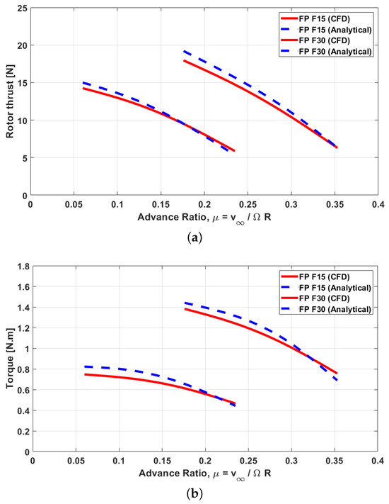 Previous research established an analytical expression for the inflow ratio of shrouded rotors in hover, which was validated using both CFD simulations and experimental measurements [42]. In forward flight, however, the aerodynamic role of the shroud changes: as the flight speed increases, the shroud’s contribution transitions from augmenting thrust to producing drag. The analytical model developed in this study does not account for the shroud’s thrust or drag in forward flight. Moreover, the objective of this work is not to optimize the shroud design itself, but rather to focus on rotor performance modeling and comparison between fixed- and variable-pitch configurations.