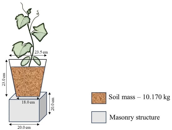 Thirty-two pots were used in Experiment I and another thirty-two pots in Experiment II. Each pot was placed on a masonry base measuring 0.20 × 0.20 × 0.20 m (height, length, and width), equidistant in all directions by 0.50 m. Additionally, 7.77 L pots were fitted with a drainage system consisting of fourteen holes, each 7 mm in diameter, at the lower end of the pot. A 45 cm diameter piece of Clarite mesh was placed at the bottom of the pot as a physical barrier to prevent soil loss. Finally, the pot was filled in layers, maintaining a density of 1.5 g cm−3, with a total of 9 kg of dry soil mass, corresponding to 10.170 kg of wet soil mass. (Figure 1).
