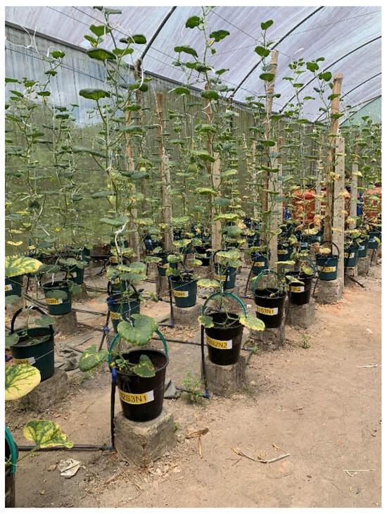 After transplanting into the pots, the seedlings were tutored using strings to grow upright until reaching the height of the trellis (2.5 m) (Figure 2).