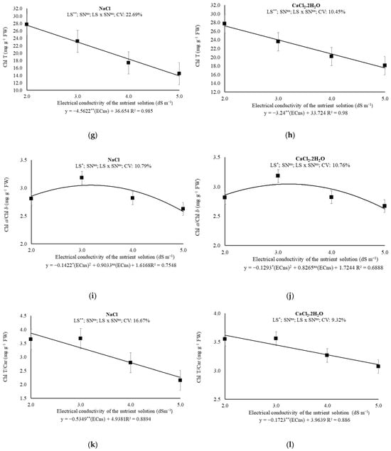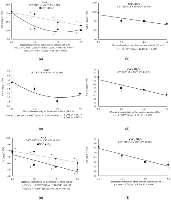 In Experiment II (waters salinized with CaCl2), the electrical conductivity of the nutrient solution (ECns) significantly affected (p ≤ 0.05) Chl a, Chl b, Car, and Chl T, and it affected (p ≤ 0.01) Chl a/Chl b, ChlT/Car; still regarding the second experiment, individually, no significance was observed for the interaction between ECns and N sources (p > 0.05) (Table S3).