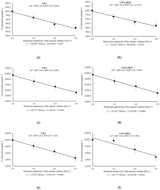 It is worth noting, however, that the prevalence of Ca2+ resulted in lower accumulated losses when comparing Fo and Fv of plants under 2.0 and 5.0 dS m−1 and greater losses of Fm in the same ECns range. Ca2+ deficiency in plants implies a reduction in Fm (verified in tomato plants), in addition to damaged cell membranes (in peach plants) and impaired biosynthesis of chlorophyll and chlorophyll precursors [52]. On the other hand, excess induces the closure of leaf stomata, thus reducing photosynthesis; it affects the absorption and utilization of magnesium, and the efficiency of light energy utilization in leaves is reduced [53].