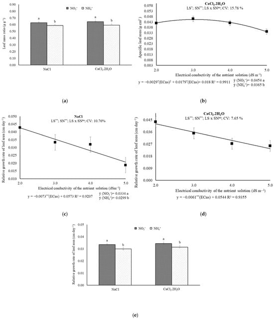 Under the prevalence of NaCl in the water, it was found that when NH4+ was used as the N source, the Chl a content was reduced at a rate of 2.3696 mg g−1 of FW for each unit increase in ECns; on the other hand, when NO3− was used as the N source, the Chl a content was minimum (9.17 mg g−1 of FW) at an ECns estimated at 4.2 dS m−1. In this sense, when comparing the N sources within each ECns, it was found that Chl a was 20.31% higher when NH4+ was used as the N source, within the ECns of 3.0 dS m−1 (Figure 3a).