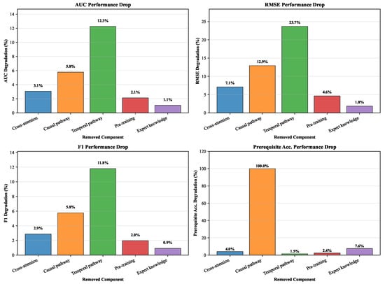 Figure 4 visualizes the relative contribution of different components, clearly showing the cross-attention mechanism and causal pathway as the most critical elements for achieving superior performance. The analysis reveals distinct patterns of component importance across evaluation metrics. The causal pathway demonstrates the most dramatic impact, with its removal causing substantial performance degradation across all metrics—particularly devastating for prerequisite discovery (100% loss) and significant for predictive performance (5.8% AUC drop, 12.9% RMSE increase). The cross-attention integration mechanism emerges as the second-most critical component, contributing 3.1% AUC improvement and 7.1% RMSE reduction, confirming that bidirectional information flow between pathways is essential for optimal performance. Temporal pathway removal severely impacts prediction accuracy (12.3% AUC degradation) while surprisingly maintaining high prerequisite discovery capability (87.9%), highlighting the complementary roles of both pathways. Pre-training contributes consistently but moderately across metrics (2.1% AUC improvement), validating the benefits of large-scale initialization without being architecturally critical. Expert knowledge integration shows the smallest but meaningful impact (1.1% AUC gain, 7.6% prerequisite accuracy improvement), suggesting our model effectively learns causal structures from data while benefiting from pedagogical guidance. The differential impact patterns confirm our architectural design choices and demonstrate that both temporal modeling and causal reasoning are necessary for achieving state-of-the-art performance in interpretable knowledge tracing.