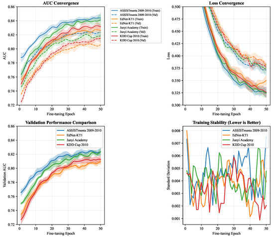Figure 5 illustrates convergence behavior across datasets, demonstrating stable training dynamics and consistent convergence within 50 fine-tuning epochs. The curves show minimal overfitting and smooth convergence patterns, indicating robust optimization despite the complex multi-objective loss function. The analysis reveals several critical training characteristics. First, all datasets exhibit rapid initial improvement in the first 10–15 epochs, with AUC gains of 4–6% and loss reductions of 15–20%, indicating effective knowledge transfer from pre-training. Second, the training and validation curves maintain close alignment throughout the process, with validation performance tracking training performance within 1–2% across all datasets, demonstrating excellent generalization without overfitting. Third, the shaded confidence intervals (±1 standard deviation) remain narrow and consistent, showing training stability with standard deviations below 0.01 for AUC and 0.02 for loss metrics. Fourth, convergence occurs between epochs 25–35 for most datasets, well within the 50-epoch fine-tuning window, with performance stabilization indicated by minimal fluctuations in the final epochs. Fifth, dataset-specific patterns emerge—EdNet-KT1 shows slightly slower convergence due to its large scale, while ASSISTments converges fastest due to clearer mathematical structures. The loss curves demonstrate exponential decay patterns typical of well-conditioned optimization, while AUC curves show smooth logarithmic growth toward asymptotic performance limits. The consistent convergence across diverse educational domains validates our training methodology and confirms that the hybrid architecture learns effectively despite its complex dual-pathway design and multi-objective optimization requirements.