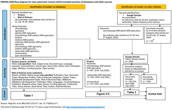 The PRISMA 2020 flow diagram illustrates the entire workflow process of searching, selecting, and including documents for the studied topic: “Application of Chronobiology in Plant Agriculture—a Systematic Review”. Database names, keywords, and the number of documents are shown. The analyses were carried out on 18–29 July, 27 August, 2025, * References: [1,8,11,19,28,52,53,54,55,56].