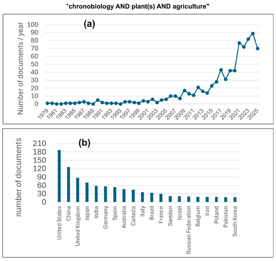 The above data were also analyzed using statistics provided by the Scopus database (“Analyze results”). Figure 2 presents the number of documents published each year between 1979 and 2025 and the number of documents published by individual countries during this period (Top 20). A noticeable increase in publications began around the year 2000 (from fewer than 10 per year to approximately 20 per year after 2011). This number doubled around 2017 (to about 40 per year) and doubled again from approximately 2021 onwards (to nearly 80 per year) (Figure 2a). The largest number of publications originated from the United States (approx. 180) and China (approx. 120) (Figure 2b). The United Kingdom, Japan, India, Germany, Spain, Australia, and Canada followed, each contributing approximately 60–90 publications. In other countries, the number of publications was generally below 30. These results indicate that the main research centers focusing on chronobiology and plant cultivation are widely distributed across the world.
