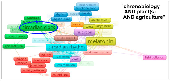 The co-occurrence of keywords for the “agro chronobiology” topic was mapped using VOSviewer (source file from Scopus—Table S6) and is shown in Table S5. Map parameters are the same as for Map 3 (for chronoculture) shown in Table 2.
