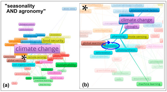 VOSviewer Map 2—author keywords co-occurrence. Keywords: “seasonality AND agronomy”, Scopus, all field, 424 review documents from the last 2.5 years (2023–July 2025) (Table 1). Source file available as Table S3, author keywords co-occurrence, minimum number of occurrences of keyword—3, 84 items in 13 clusters, (a) whole map, (b) fragment of the map showing co-occurrence of the “seasonality” and “phenology” keywords. Detailed numerical data are provided in Table 2. Blue circle—a particularly important research theme in chronobiology.