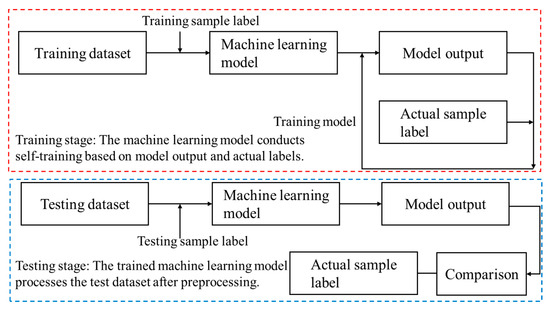 The machine learning algorithms utilized for underwater acoustic source localization are primarily supervised learning models. During the training stage, each feature in the dataset must be paired with its corresponding actual labels, allowing the machine learning model to undergo self-training by minimizing the discrepancy between its outputs and the actual labels through iterative optimization. The quality of the trained model is assessed during the testing stage, where a preprocessed test dataset is input into the trained model. By comparing the predicted labels generated by the model with those from actual test data, one can evaluate the effectiveness of the model training process. The algorithm flows of machine learning for underwater acoustic source localization is shown in Figure 1.