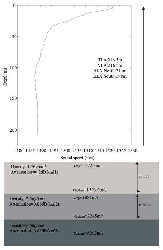 For the waveguide, the water depth is assumed to be the water depth at the array for range-independent processing. The seafloor is composed first of a 23.5 m-thick sediment layer with a density of 1.76 g/cm3 and an compressional attenuation of 0.2 dB/kmHz. The top of the sediment layer has a compressional acoustic speed of 1572.368 m/s, while the bottom of the sediment layer has a compressional acoustic speed of 1593.016 m/s. Below the sediment lay an 800 m thick mudstone layer with a density of 2.06 g/cm3 and an attenuation of 0.06 dB/kmHz. The top and bottom acoustic speeds of the mudstone layer are 1881 m/s and 3245 m/s, respectively. The geoacoustic model is completed by a half space with a density of 2.66 g/cm3, an attenuation of 0.020 dB/kmHz, and a compressional acoustic speed of 5200 m/s [27].