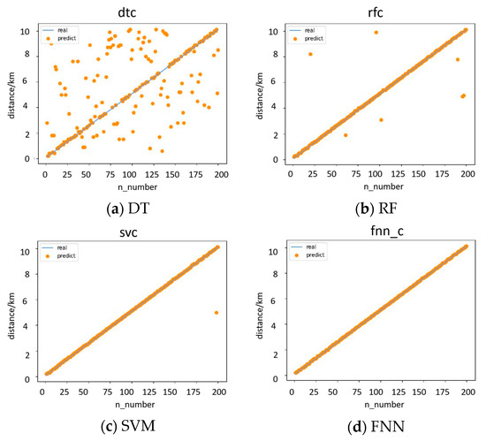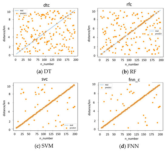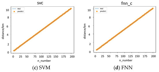 The blue solid line represents the actual distance of the simulated acoustic source, while the orange dispersion points indicate the distances predicted by various machine learning algorithms. When the SNR is 2 in the Figure 3, the accuracy of the DT model is only 0.05, whereas the RF model achieves an accuracy of 0.31. The SVM and FNN models perform significantly better, with classification accuracies of 0.65 and 0.66, respectively. When the SNR increases to 5 in the Figure 4, the classification accuracy of all models improves slightly. Specifically, the DT model’s accuracy rises to 0.33 and the RF model’s accuracy increases to 0.87. The SVM and FNN models achieve classification accuracies of 0.93 and 0.95, respectively. At a SNR of 10 in the Figure 5, all models show substantial improvements in classification accuracy (see Figure 5). The DT model reaches an accuracy of 0.66, while the RF, SVM, and FNN models achieve an accuracy of 0.94, 0.95, and 0.96, respectively.