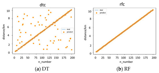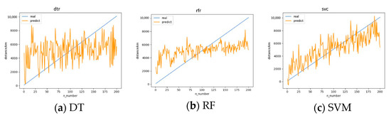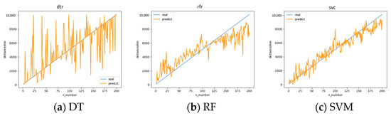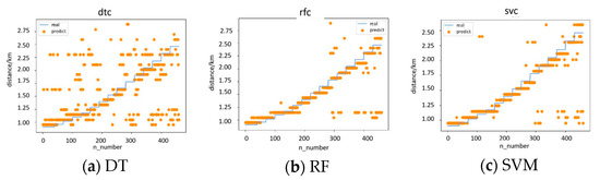 Here, 100 calculations were performed in the experiment results. The reliability was set at 96%. The confidence intervals were set relative to 92–100% of the truth range to up and down of the real data (blue line) to reduce the prediction error. Among them, the final classification accuracy rates of the three algorithms are 0.44, 0.65, and 0.69. Comparing the experimental results with the simulation data in Section 3, we can conclude that, among the different machine learning methods, the prediction results of several classification algorithms are all quite satisfactory. Although the accuracy rates of the three models are not very high, it can be seen from Figure 13 that the outliers of the overall data are relative, and they are roughly all near the blue solid line representing the actual distance. Due to its instability and being greatly affected by noise, the DT model has slightly more outliers than the other two algorithms, but it can still reveal the approximate location of the acoustic source. The RF model and the SVM model are relatively stable and have smaller prediction errors. Another reason is the data segment adopted is the latter part, which has a relatively high SNR.